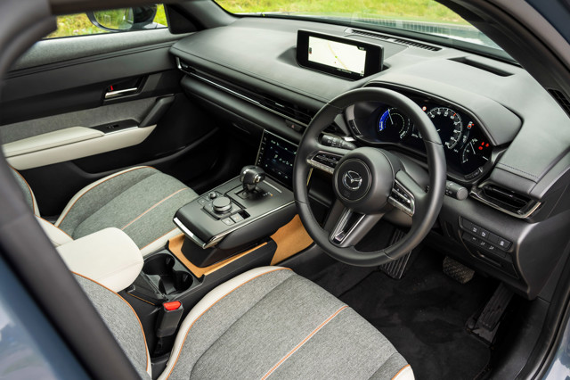 As the MX-30 has that slightly taller mini-crossover vibe, there’s a decent view of the road ahead and it gets up to motorway speed without too much fuss and has a bit left in reserve if you need it. The suspension is also quite soft at speed, although repeated undulations will leave it a bit flustered.
