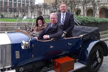 Pictured after the meeting, leaving the Palace of Westminster in Lord Montagu’s 1914 Rolls Royce Alpine Eagle from the National Motor Museum collection, are Lord Montagu of Beaulieu (front driving), Minister Mike Penning MP (front passenger), Rt Hon Greg Knight MP (rear).