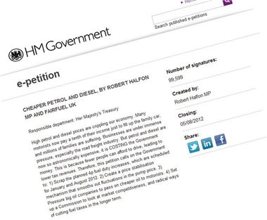 A petition on the Downing Street website demanding lower petrol and diesel prices is within touching distance of 100,000 signatures - the figure that triggers a debate in Parliament.