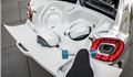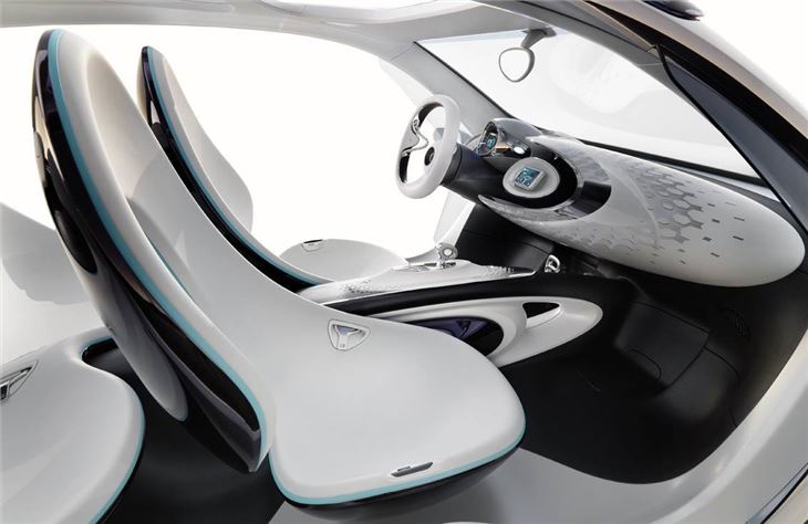 As you'd expect of a concept there are some quirky features. In this case two electric skateboards which are fastened on the roof. Inside there's a spherical instrument cluster and a single-spoke steering wheel reminiscent of the original Smart.