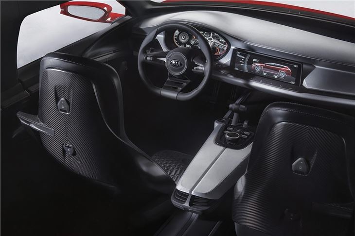 The interior features the usual concept car flights of fantasy, including once-piece carbon-fibre backed seats, an aircraft throttle inspired gear selector and a pair of large touchscreen systems.