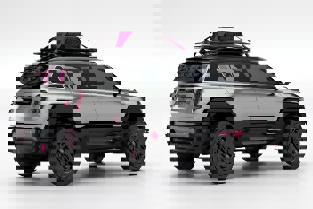 We love the cool new dayglo pink Renault 4 logo, too – a colour that is used throughout the Gun Metal Silver vehicle, including on the straps holding down the spare wheel that sits on the carbon fibre roof, and those securing the shovel and waffle boards on the bootlid. It’s all part of Renault’s determination to underline the new Renault 4Ever Trophy’s proper off-road abilities.